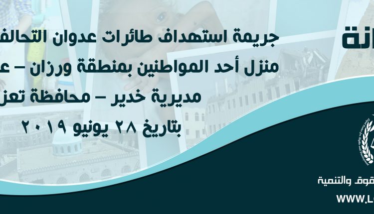 بيان إدانة| جريمة استهداف طائرات عدوان التحالف السعودي منزل أحد المواطنين بمنطقة ورزان – عزلة البدو – مديرية خدير – محافظة تعز –  بتاريخ 28 يونيو 2019.
