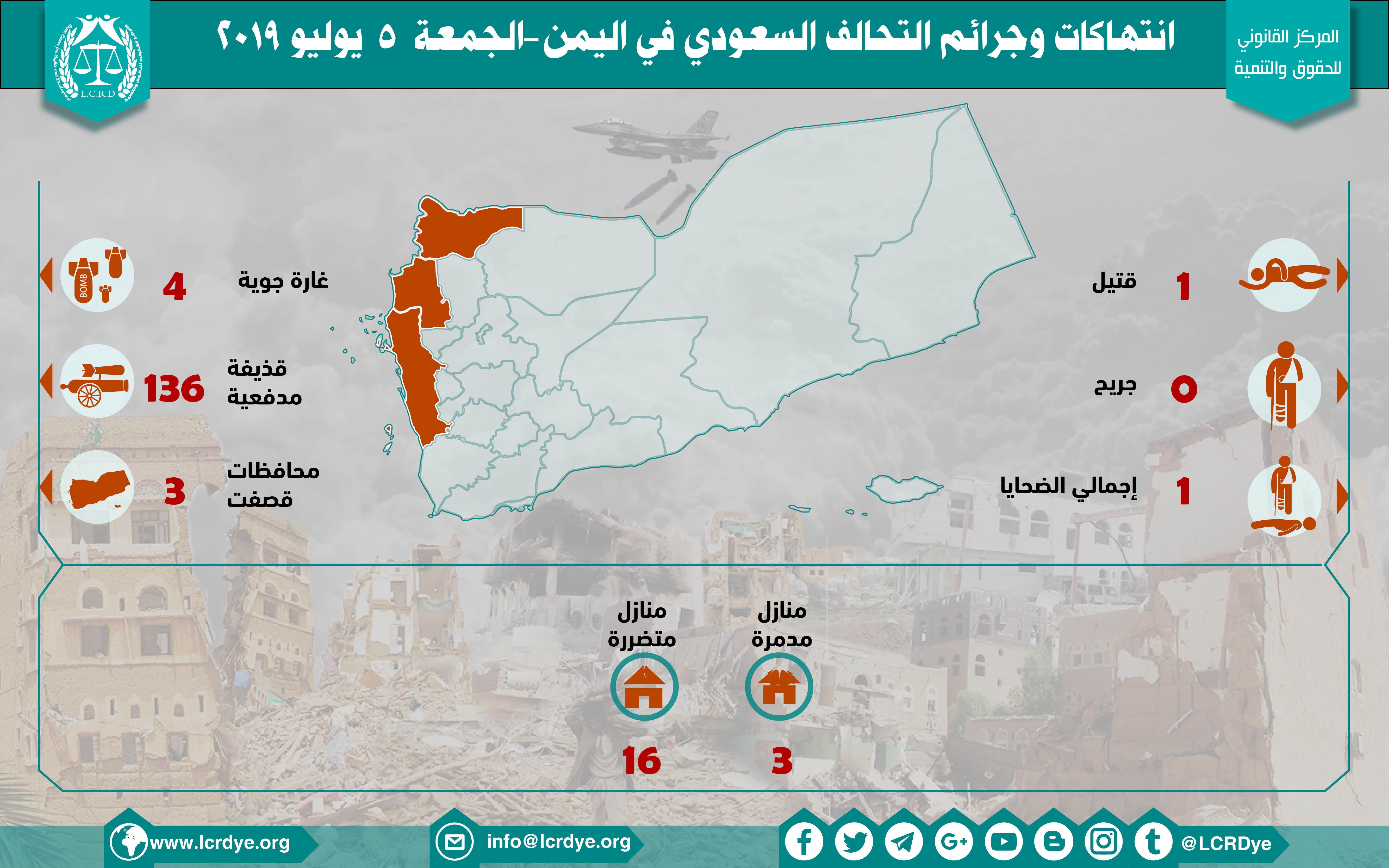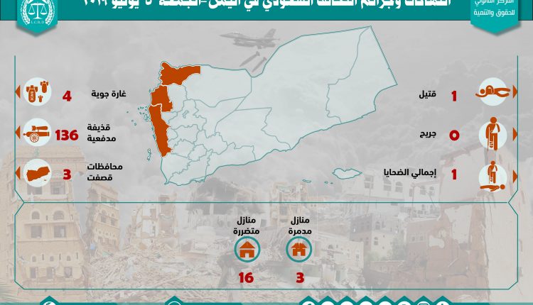 إحصائية أولية لإنتهاكات التحالف السعودي في اليمن 5 يوليو 2019 Last updated يوليو 6, 2019 للتحميل : استهداف المنشآت الاقتصاديةاستهداف المنشآت المدنيةالتحالف السعوديالمركز القانوني للحقوق والتنميةاليمنرصد وتوثيق انتهاكات التحالف السعوديعاصفة الحزمغارات التحالف السعودي على اليمن Share FacebookTwitterGoogle+ReddItWhatsAppPinterestالبريد الإلكتروني