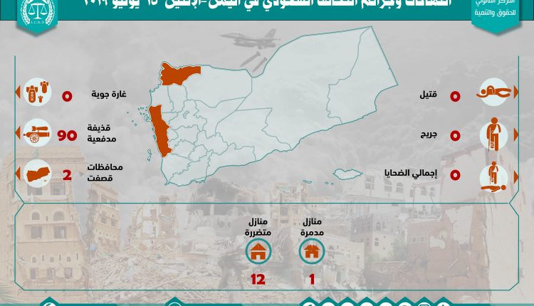 إحصائية أولية لإنتهاكات التحالف السعودي في اليمن 15 يوليو 2019 Last updated يوليو 31, 2019 للتحميل : استهداف البنى التحتيةالتحالف السعوديالمركز القانوني للحقوق والتنميةاليمنرصد وتوثيق انتهاكات التحالف السعوديعاصفة الحزمغارات التحالف السعودي على اليمن Share FacebookTwitterGoogle+ReddItWhatsAppPinterestالبريد الإلكتروني