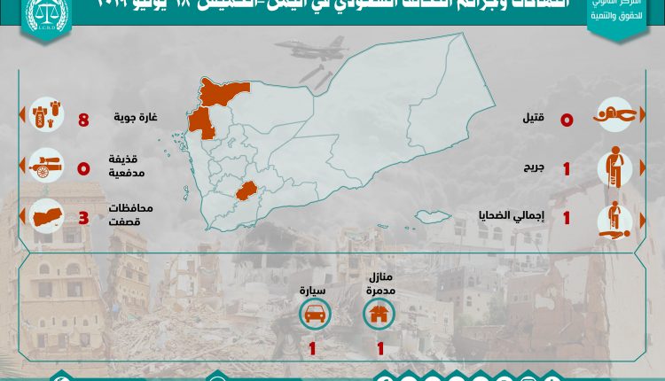 إحصائية أولية لإنتهاكات التحالف السعودي في اليمن 18 يوليو 2019 Last updated يوليو 21, 2019 للتحميل : استهداف المدنييناستهداف المنشآت المدنيةالمركز القانوني للحقوق والتنميةاليمنجرائم ضد الانسانيةعاصفة الحزمغارات التحالف السعودي على اليمن Share FacebookTwitterGoogle+ReddItWhatsAppPinterestالبريد الإلكتروني