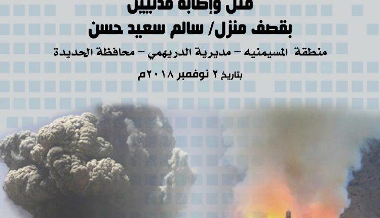 شنت طائرة حربية للتحالف السعودي غارة جوية في ساعة مبكرة من صباح الجمعة الموافق 2/11/2018 على منزل المواطن سالم سعيد حسن الكائن بمنطقة المسيمنية مديرية الدريهمي- محافظة الحديدة، أسفرت عن مقتل طفل وجرح (4) مدنيين آخرين (3) أطفال ورجل كهل يناهز عمره (65) عاماً، كما دمرت الغارة المنزل تدمير شبه كلي ونفوق قطعان الأبقار والأغنام التي كانت تشكل مصدر دخل الأسرة المنكوبة.
