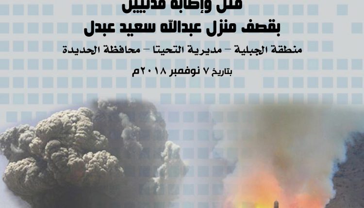 في سياق الجرائم ضد الإنسانية والإبادة الجماعية التي دأب على ارتكابها وممارستها التحالف السعودي ضد المدنيين وعائلاتهم في اليمن منذ شروعه في العدوان والحصار في أواخر شهر مارس منذ العام 2015م وحتى تاريخ كتابة هذا التقرير شن طيران التحالف السعودي عند الساعة الـ8:00 من مساء يوم الأربعاء الموافق 7 نوفمبر 2018م غارتين جويتين استهدفت منزلاً مدنياً تسكنه عائلتان إحداها نازحة بمنطقة الجبلية بمديرية التحيتا- محافظة الحديدة، أسفرت عن مقتل (6) مدنيين بينهم (3) أطفال وامرأتان وأب الأسرة المدنية النازحة وجرح (4) مدنيين آخرين هم امرأتان وطفل والابن الأكبر للعائلة النازحة المستهدفة كما دمرت المنزل الذي يأويهم وسيارة هيلوكس تابعة لهم كانت المصدر الوحيد للعيش والحياة.
