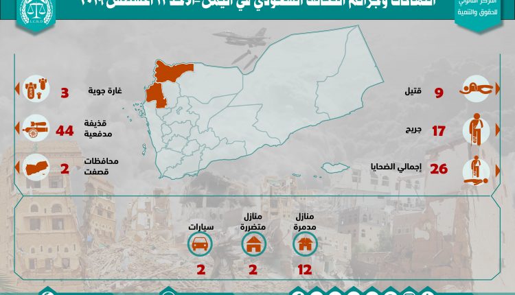 إحصائية أولية لإنتهاكات التحالف السعودي في اليمن 11 اغسطس 2019 Last updated أغسطس 21, 2019 للتحميل : استهداف البنى التحتيةاستهداف المنشآت المدنيةالتحالف السعوديالمركز القانوني للحقوق والتنميةرصد وتوثيق انتهاكات التحالف السعوديعاصفة الحزمغارات التحالف السعودي على اليمن Share FacebookTwitterGoogle+ReddItWhatsAppPinterestالبريد الإلكتروني