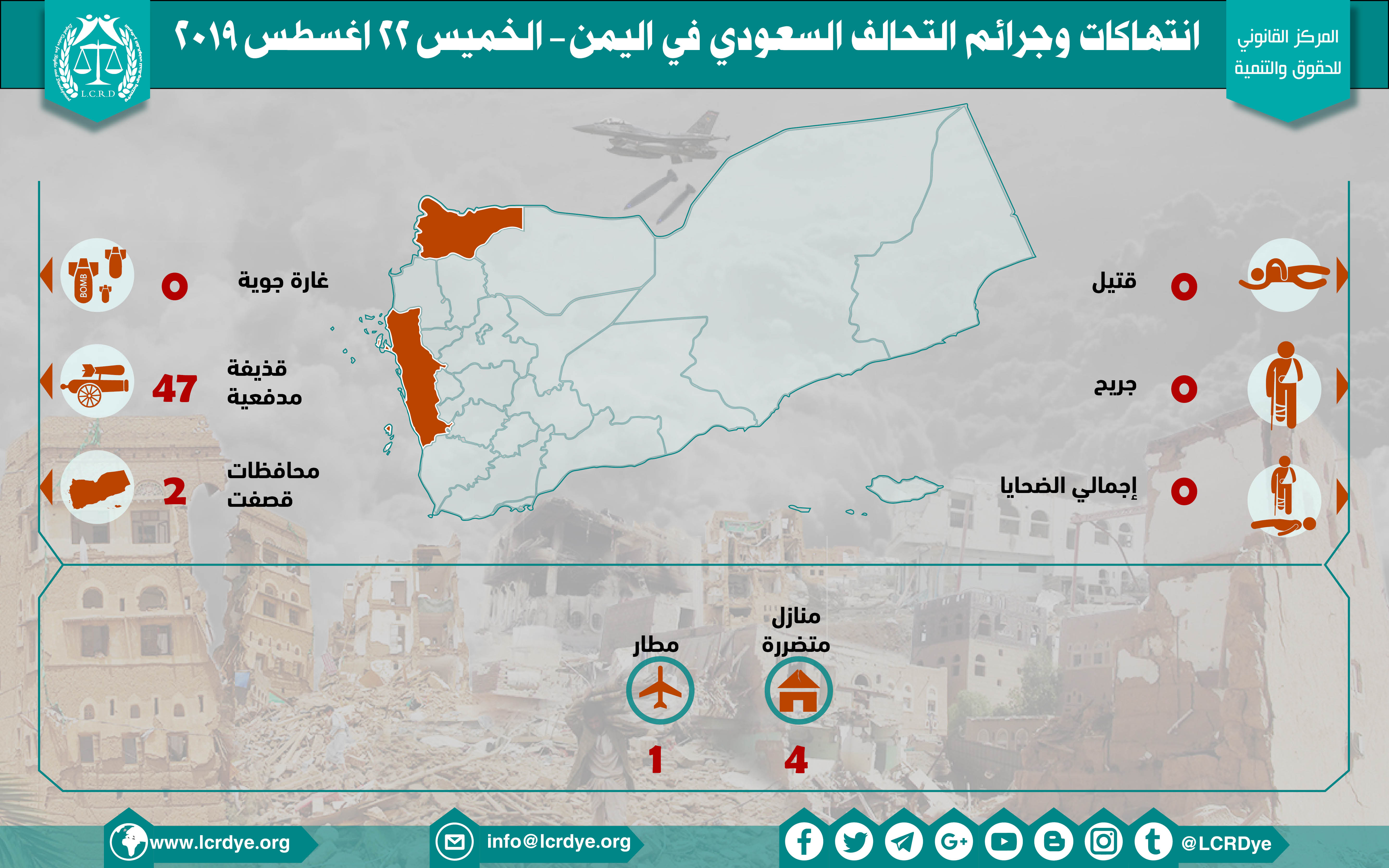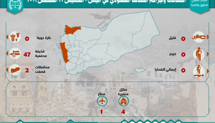 إحصائية أولية لإنتهاكات التحالف السعودي في اليمن 22 اغسطس 2019 Last updated أغسطس 25, 2019 للتحميل : استهداف المدنييناستهداف المنشآت المدنيةالمركز القانوني للحقوق والتنميةاليمنرصد وتوثيق انتهاكات التحالف السعوديعاصفة الحزمغارات التحالف السعودي على اليمن Share FacebookTwitterGoogle+ReddItWhatsAppPinterestالبريد الإلكتروني