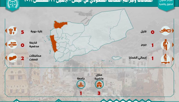 إحصائية أولية لإنتهاكات التحالف السعودي في اليمن 26 اغسطس 2019 Last updated سبتمبر 22, 2019 للتحميل : التحالف السعوديالمركز القانوني للحقوق والتنميةاليمنرصد وتوثيق انتهاكات التحالف السعوديعاصفة الحزمغارات التحالف السعودي على اليمن Share FacebookTwitterGoogle+ReddItWhatsAppPinterestالبريد الإلكتروني