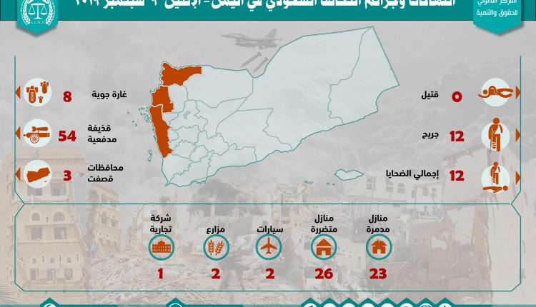 إحصائية أولية لإنتهاكات التحالف السعودي في اليمن 9 سبتمبر 2019 Last updated سبتمبر 22, 2019 للتحميل : استهداف البنى التحتيةاستهداف المدنييناستهداف المنشآت الاقتصاديةاستهداف المنشآت المدنيةالتحالف السعوديالضحايا المدنيين في اليمنالمركز القانوني للحقوق والتنميةجرائم ضد الانسانية Share FacebookTwitterGoogle+ReddItWhatsAppPinterestالبريد الإلكتروني