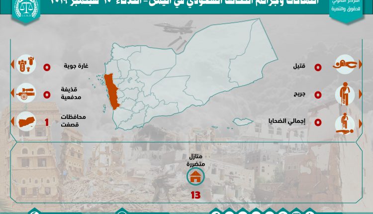 إحصائية أولية لإنتهاكات التحالف السعودي في اليمن 10 سبتمبر 2019 Last updated سبتمبر 22, 2019 للتحميل : التحالف السعوديالمركز القانوني للحقوق والتنميةاليمنرصد وتوثيق انتهاكات التحالف السعوديعاصفة الحزمغارات التحالف السعودي على اليمن Share FacebookTwitterGoogle+ReddItWhatsAppPinterestالبريد الإلكتروني