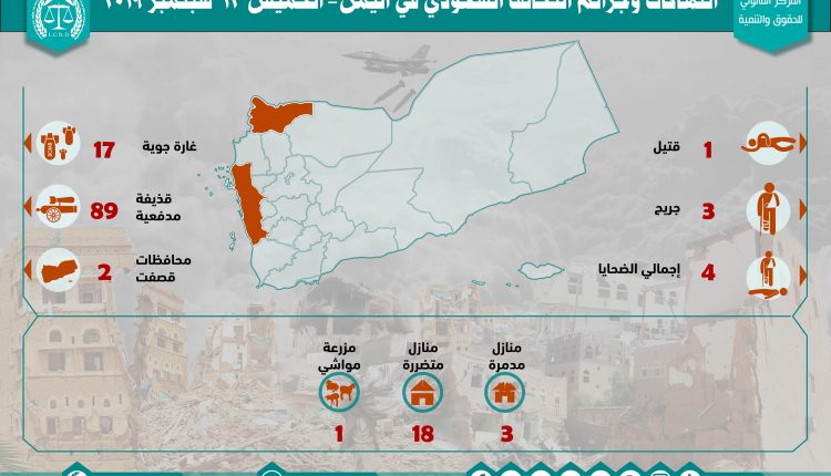 إحصائية أولية لإنتهاكات التحالف السعودي في اليمن 12 سبتمبر 2019 Last updated سبتمبر 22, 2019 للتحميل : استهداف المدنيينالتحالف السعوديالمركز القانوني للحقوق والتنميةاليمنرصد وتوثيق انتهاكات التحالف السعوديعاصفة الحزمغارات التحالف السعودي على اليمن Share FacebookTwitterGoogle+ReddItWhatsAppPinterestالبريد الإلكتروني