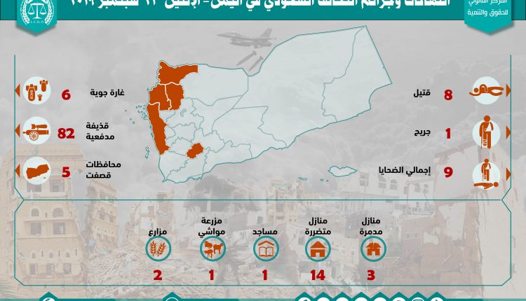 إحصائية أولية لإنتهاكات التحالف السعودي في اليمن 23 سبتمبر 2019 Last updated سبتمبر 24, 2019 للتحميل : استهداف المدنيينالتحالف السعوديالضحايا المدنيين في اليمنالمركز القانوني للحقوق والتنميةرصد وتوثيق انتهاكات التحالف السعوديعاصفة الحزمغارات التحالف السعودي على اليمن Share FacebookTwitterGoogle+ReddItWhatsAppPinterestالبريد الإلكتروني