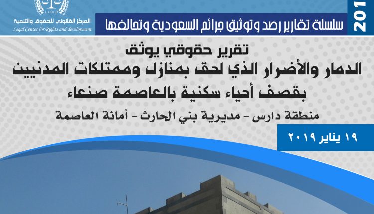 الدمار والأضرار الذي لحق بمنازل وممتلكات المدنيين بقصف أحياء سكنية بالعاصمة صنعاء منطقة دارس – مديرية بني الحارث – أمانة العاصمة بتاريخ 19 يناير 2019