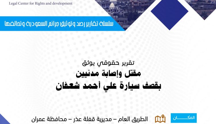 أغارت طائرة حربية للتحالف السعودي بصاروخ جوي عند الساعة الـ11:00 مساء يوم الثلاثاء 26 فبراير 2019م على سيارة المواطن علي أحمد شعفان أثناء مروره بالطريق العام بمديرية قفلة عذر- محافظة عمران، دمرت الغارة السيارة وسقط (2) عمال مدنيين قتلى بشاعة الجريمة ظاهرة للعيان، من خلال المشاهد الموثقة لجثث العاملين الضحايا الذين تفحمت أجسادهم جراء الغارة الوحشية والعمال هم: حمير محمد قارة 20 عاماً، ناصر يحيى غادر 21 عاماً، كما جرح صاحب السيارة علي أحمد شعفان البالغ من العمر 35 عاماً.