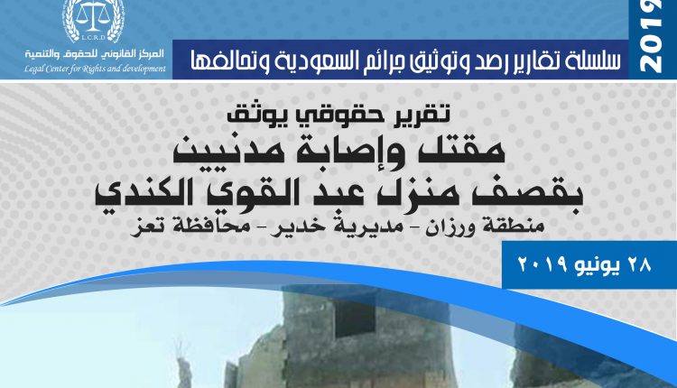 عند الساعة الـ 5:00 من مساء يوم الجمعة الموافق 28يونيو 2019م شنت طائرة حربية أو أكثر للتحالف السعودي غارتين جويتين استهدفت منزل المواطن/ عبد القوي عبده الكندي – الكائن في منطقة ورزان – مديرية خدير – محافظة تعز دمرت الغارات المنزل على رؤوس ساكنيه وأسفرت عن مقتل (6) مدنيين من الأسرة بينهم (3) أطفال وامرأة مسنة ورجلين هما صاحب المنزل وأحد أبنائه، وأسماء الضحايا : عبد القوي عبده الكندي (70) عاماً، وزوجته حياة عبده سيف (60) عاماً، وابنائهم أحمد عبد القوي (30) عاماً ، وحسين عبد القوي (12) عاماً، وحفيديهما حمزه أحمد عبد القوي (7) سنوات ، وأيمن علي عبد القوي (4) سنوات، احالت الغارات أجساد القتلى ال 6 الى أشلاء بعثرتها بين الركام وبعضها عثر عليها الأهالي في محيط المنزل كما أصيب الطفل / عبد القوي منير عبد القوي (17) عاماً، تم إنقاذه واسعافه إلى المستشفى بعد مضي نصف ساعة من تنفيذ الطائرات غاراتها على المنزل و دمرت الغارات سيارتين والحقت أضرار جسيمة بسيارتين أخرى و(3) شاحنات لنقل الأغذية وحراثة جميعها تتبع صاحب المنزل الضحية عبد القوي الكندي.