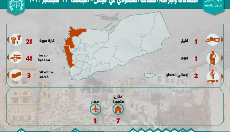 إحصائية أولية لإنتهاكات التحالف السعودي في اليمن 27 سبتمبر 2019 Last updated سبتمبر 29, 2019 للتحميل : استهداف البنى التحتيةالتحالف السعوديالضحايا المدنيين في اليمنالمركز القانوني للحقوق والتنميةاليمنرصد وتوثيق انتهاكات التحالف السعوديعاصفة الحزمغارات التحالف السعودي على اليمن Share FacebookTwitterGoogle+ReddItWhatsAppPinterestالبريد الإلكتروني
