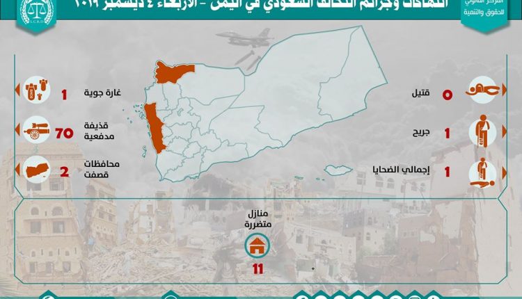 إحصائية أولية لإنتهاكات التحالف السعودي في اليمن – 4 ديسمبر 2019 Last updated ديسمبر 24, 2019 إحصائية أولية لإنتهاكات التحالف السعودي في اليمن – 4 ديسمبر 2019 تحميل التقرير لمزيد من التفاصيل Share FacebookTwitterGoogle+ReddItWhatsAppPinterestالبريد الإلكتروني