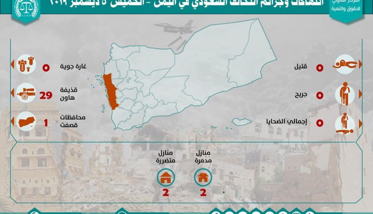 إحصائية أولية لإنتهاكات التحالف السعودي في اليمن – 5 ديسمبر 2019 Last updated ديسمبر 24, 2019 إحصائية أولية لإنتهاكات التحالف السعودي في اليمن – 5 ديسمبر 2019 تحميل التقرير لمزيد من التفاصيل Share FacebookTwitterGoogle+ReddItWhatsAppPinterestالبريد الإلكتروني