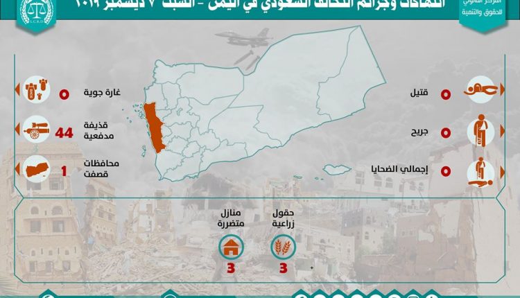 إحصائية أولية لإنتهاكات التحالف السعودي في اليمن – 7 ديسمبر 2019 Last updated ديسمبر 24, 2019 إحصائية أولية لإنتهاكات التحالف السعودي في اليمن – 7 ديسمبر 2019 تحميل التقرير لمزيد من التفاصيل Share FacebookTwitterGoogle+ReddItWhatsAppPinterestالبريد الإلكتروني