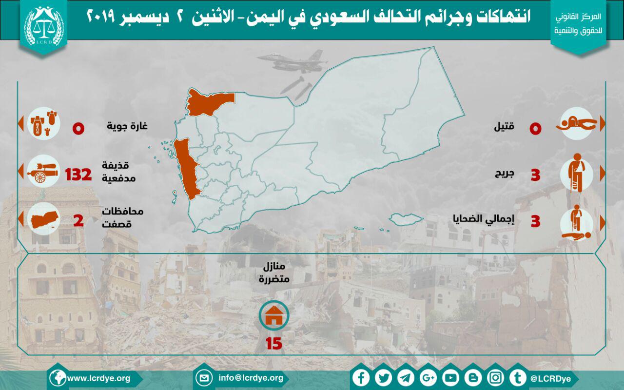 إحصائية أولية لإنتهاكات التحالف السعودي في اليمن – 2 ديسمبر 2019 Last updated ديسمبر 24, 2019 إحصائية أولية لإنتهاكات التحالف السعودي في اليمن – 2 ديسمبر 2019 تحميل التقرير لمزيد من التفاصيل Share FacebookTwitterGoogle+ReddItWhatsAppPinterestالبريد الإلكتروني