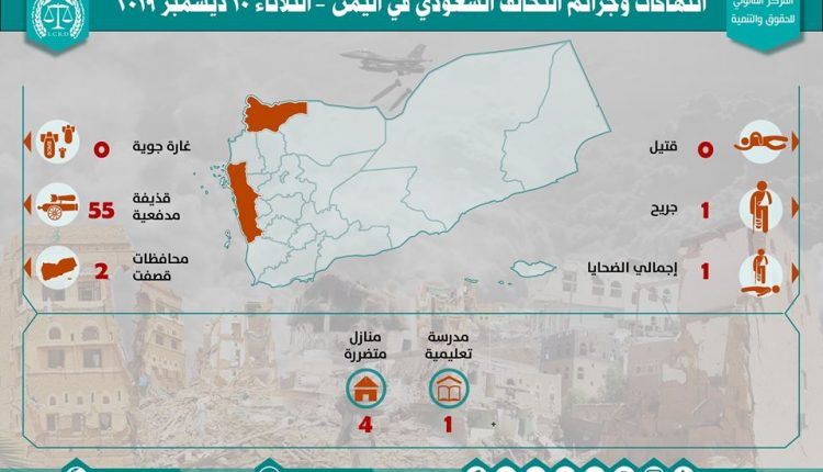 إحصائية أولية لإنتهاكات التحالف السعودي في اليمن – 10 ديسمبر 2019 Last updated ديسمبر 24, 2019 إحصائية أولية لإنتهاكات التحالف السعودي في اليمن – 10 ديسمبر 2019 تحميل التقرير لمزيد من التفاصيل Share FacebookTwitterGoogle+ReddItWhatsAppPinterestالبريد الإلكتروني