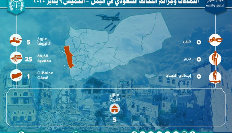 إحصائية أولية لإنتهاكات التحالف السعودي في اليمن – الخميس 9 يناير 2020 Last updated يوليو 25, 2020 إحصائية أولية لإنتهاكات التحالف السعودي في اليمن – الخميس 9 يناير 2020 تحميل التقرير لمزيد من التفاصيل Share FacebookTwitterGoogle+ReddItWhatsAppPinterestالبريد الإلكتروني