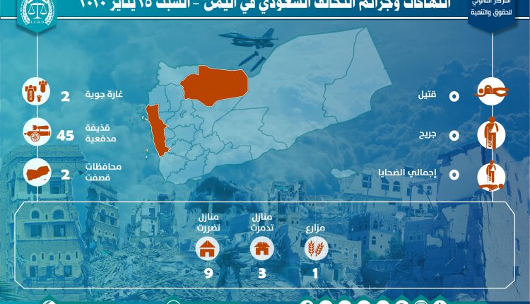 إحصائية أولية لإنتهاكات التحالف السعودي في اليمن – السبت 25 يناير 2020 Last updated فبراير 26, 2020 إحصائية أولية لإنتهاكات التحالف السعودي في اليمن – السبت 25 يناير 2020 تحميل التقرير لمزيد من التفاصيل Share FacebookTwitterGoogle+ReddItWhatsAppPinterestالبريد الإلكتروني
