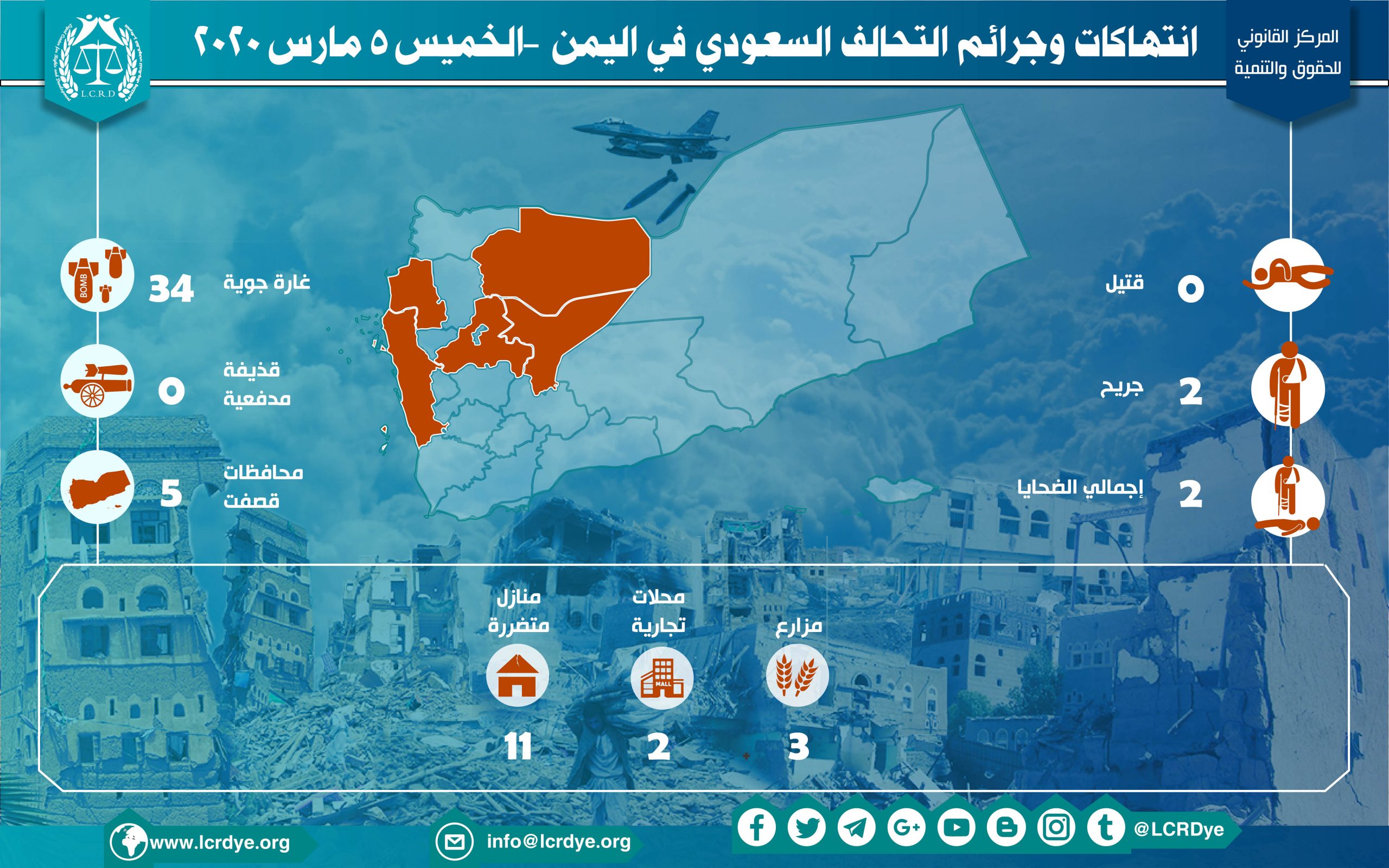 إحصائية أولية لإنتهاكات التحالف السعودي في اليمن –الخميس 5 مارس 2020 Last updated مارس 7, 2020 تحميل التقرير لمزيد من التفاصيل التحالف السعوديالمركز القانوني للحقوق والتنميةاليمنرصد وتوثيق انتهاكات التحالف السعوديعاصفة الحزمغارات التحالف السعودي على اليمن Share FacebookTwitterGoogle+ReddItWhatsAppPinterestالبريد الإلكتروني