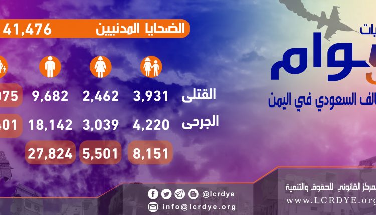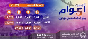 احصائيات الضحايا المدنيين نتيجة الغارات التي تشنها قوات التحالف السعودي خلال 5 أعوام منذ بداية العدوان على اليمن On أبريل 11, 2020 Share FacebookTwitterGoogle+ReddItWhatsAppPinterestالبريد الإلكتروني