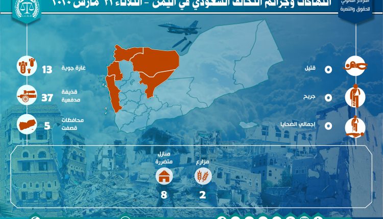 إحصائية أولية لإنتهاكات التحالف السعودي في اليمن – الثلاثاء 31 مارس 2020 Last updated أبريل 18, 2020 تحميل التقرير لمزيد من التفاصيل استهداف المنشآت المدنيةالمركز القانوني للحقوق والتنميةرصد وتوثيق انتهاكات التحالف السعوديعاصفة الحزمغارات التحالف السعودي على اليمن Share FacebookTwitterGoogle+ReddItWhatsAppPinterestالبريد الإلكتروني
