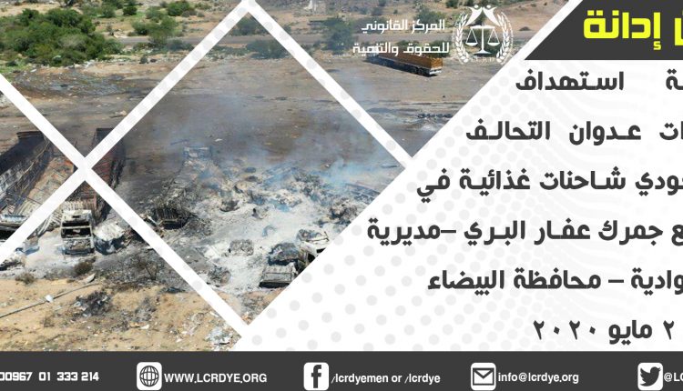 وقف المركز القانوني للحقوق والتنمية أمام الجريمة المروعة التي ارتكبها تحالف العدوان السعودي قبل فجر السبت الموافق 2 مايو 2020 بشن طيرانه الحربي غارتين جويتين على منفذ عفار الجمركي والمحجر الصحي ـ بمحافظة البيضاء حيث اصابت الغارات ناقلات شحن تجارية محملة بالأغذية والبضائع الاساسية اللازمة لحياة السكان وذلك أثناء توقفها بجمرك عفار والذي يُعد المنفذ البري الوحيد لتدفق الغذاء والدواء لسكان المحافظات الشمالية والغربية، وقد أسفرت الغارتين حسب افادة الشهود عن تدمير واحتراق (12) قاطرة و شاحنة نقل كبير وتلف جميع حمولتها بالاضافة الى سقوط ضحايا مدنيين من موظفي الجمرك وسائقي الناقلات البعض منهم من جنسيات دول شقيقة.