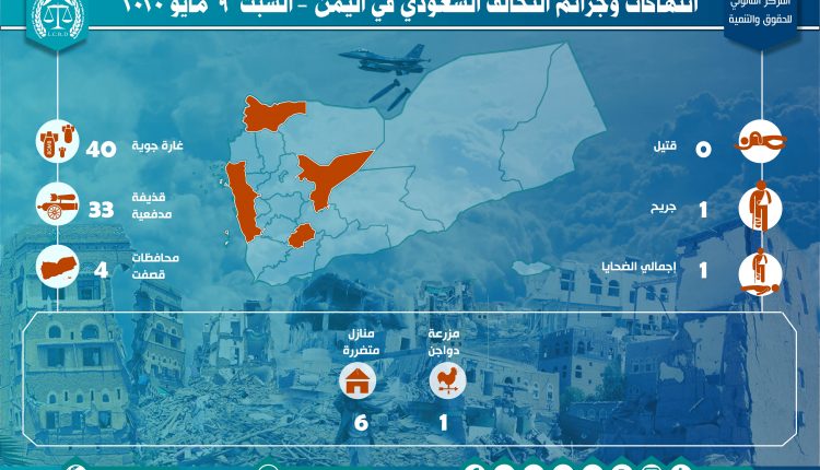 إحصائية أولية لإنتهاكات التحالف السعودي في اليمن – السبت 9 مايو 2020 Last updated مايو 18, 2020 تحميل التقرير لمزيد من التفاصيل استهداف البنى التحتيةاستهداف المدنيينالمركز القانوني للحقوق والتنميةاليمنرصد وتوثيق انتهاكات التحالف السعوديغارات التحالف السعودي على اليمن Share FacebookTwitterGoogle+ReddItWhatsAppPinterestالبريد الإلكتروني