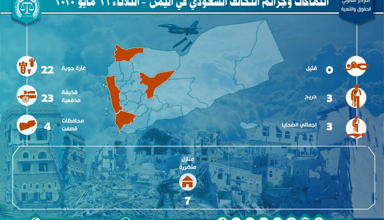 إحصائية أولية لإنتهاكات التحالف السعودي في اليمن – الثلاثاء 26 مايو 2020 Last updated يونيو 3, 2020 تحميل التقرير لمزيد من التفاصيل اليمنرصد وتوثيق انتهاكات التحالف السعوديغارات التحالف السعودي على اليمن Share FacebookTwitterGoogle+ReddItWhatsAppPinterestالبريد الإلكتروني