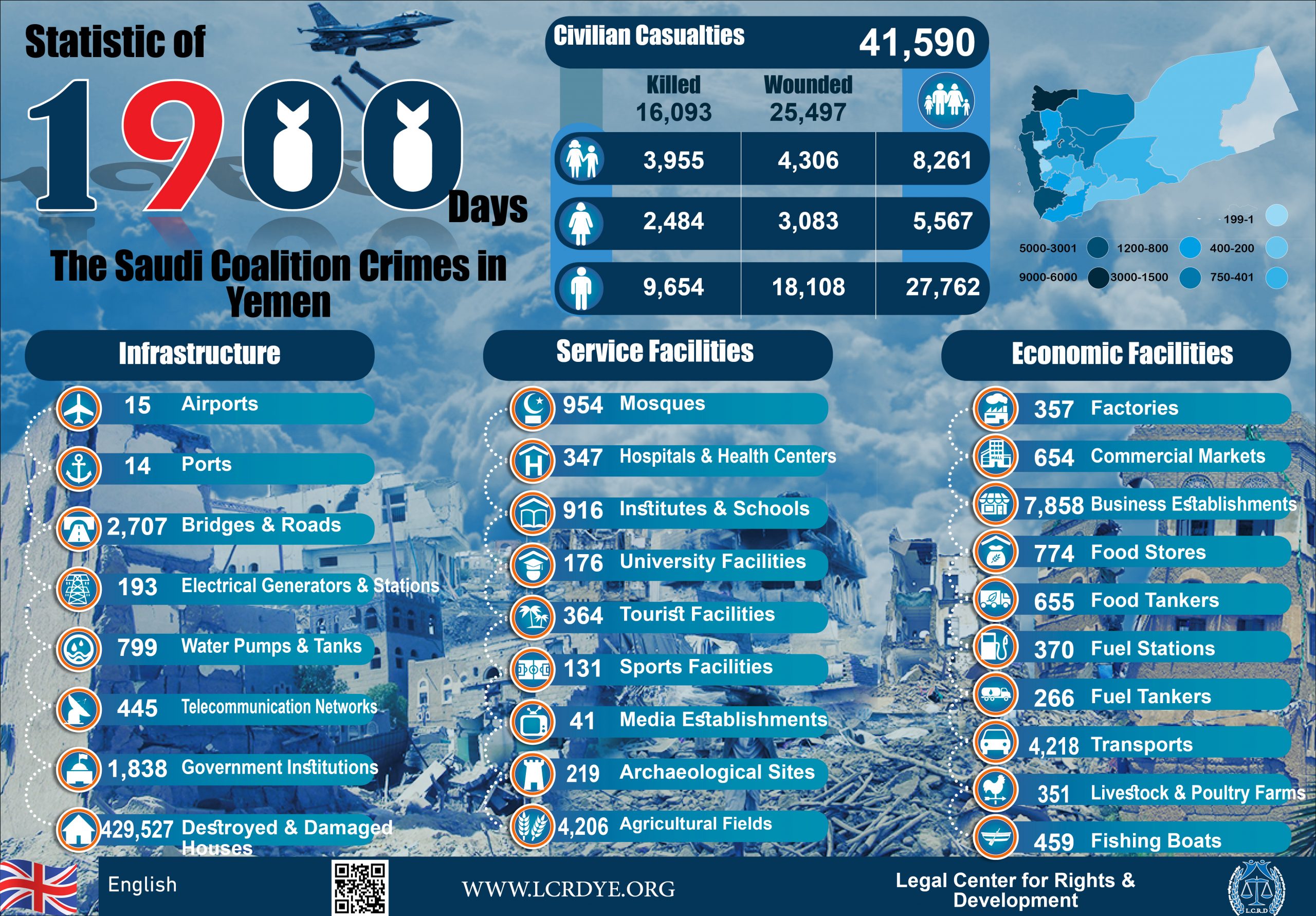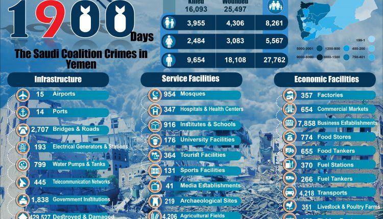 English | Infographic – Statistic of 1900 Days – The Saudi Coalition Crimes in Yemen On يونيو 12, 2020 #English Infographic – Statistic of 1900 Days – The Saudi Coalition Crimes in Yemen @lcrdye Share FacebookTwitterGoogle+ReddItWhatsAppPinterestالبريد الإلكتروني