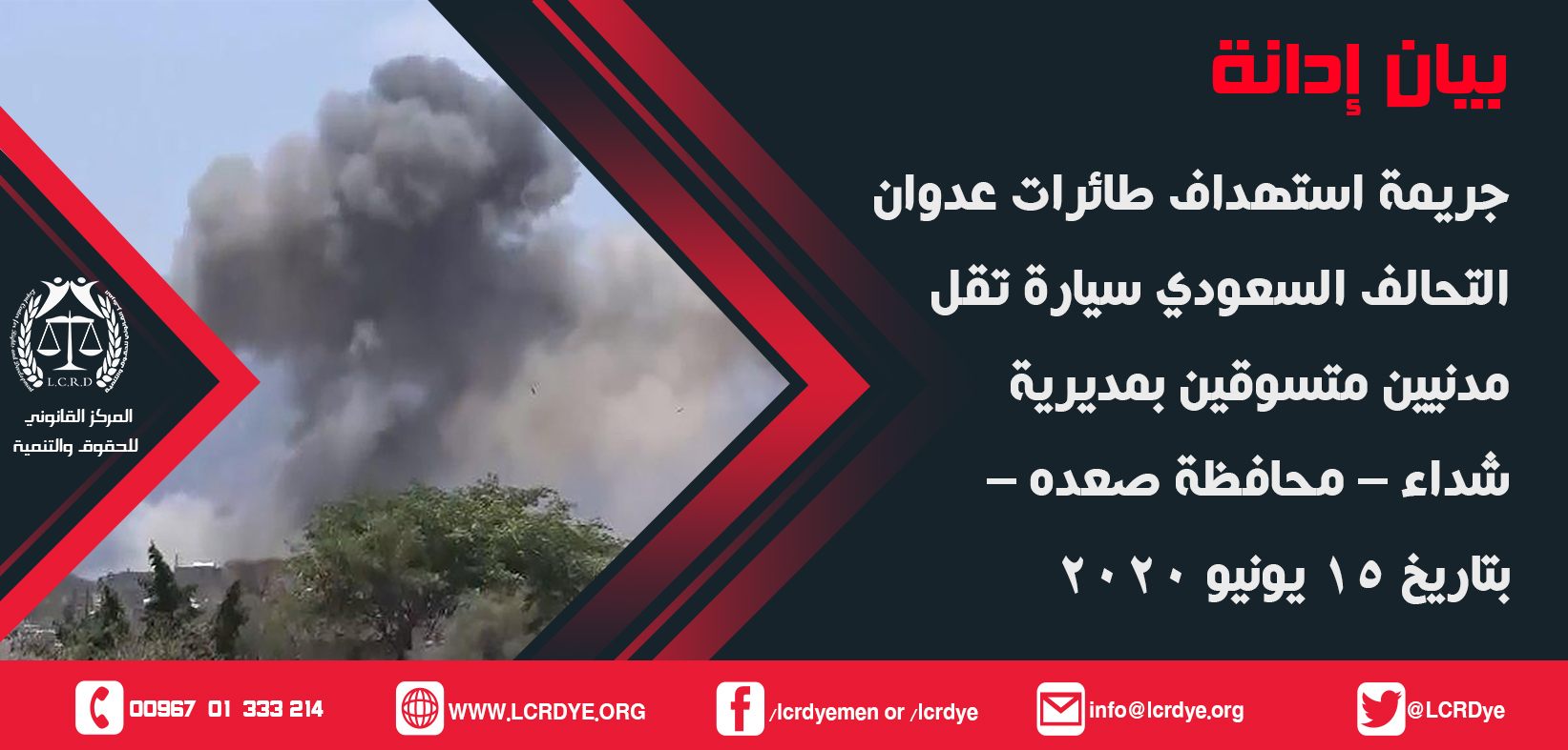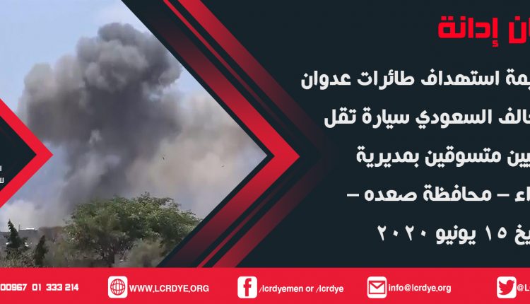 بيان إدانة| جريمة استهداف طائرات عدوان التحالف السعودي سيارة تقل مدنيين متسوقين بمديرية شداء – محافظة صعده – بتاريخ 15 يونيو 2020.
