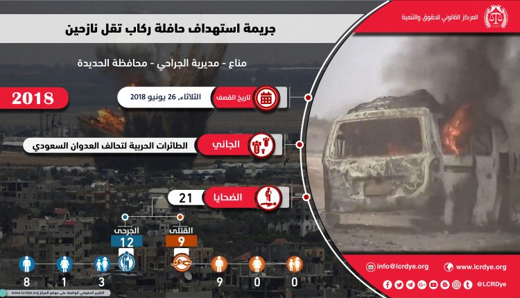 في يوم الثلاثاء الموافق 26 يونيو2018 قامت الطائرات الحربية لتحالف العدوان السعودي بشن غارات جوية استهدفت حافلة ركاب تقل نازحين في مناع بمديرية الجراحي – محافظة الحديدة تسبب في مقتل 9 مدنيين وإصابة 12 مدنياً بينهم 3 أطفال وامرأة.