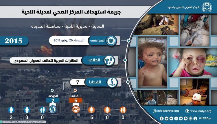 في يوم الجمعة الموافق 26 يونيو2015 قامت الطائرات الحربية لتحالف العدوان السعودي بشن غارات جوية استهدفت المركز الصحي لمدينة اللحية في المدينة بمديرية اللحية – محافظة الحديدة تسبب في مقتل 5 مدنيين وإصابة 2 مدنيين آخرين.