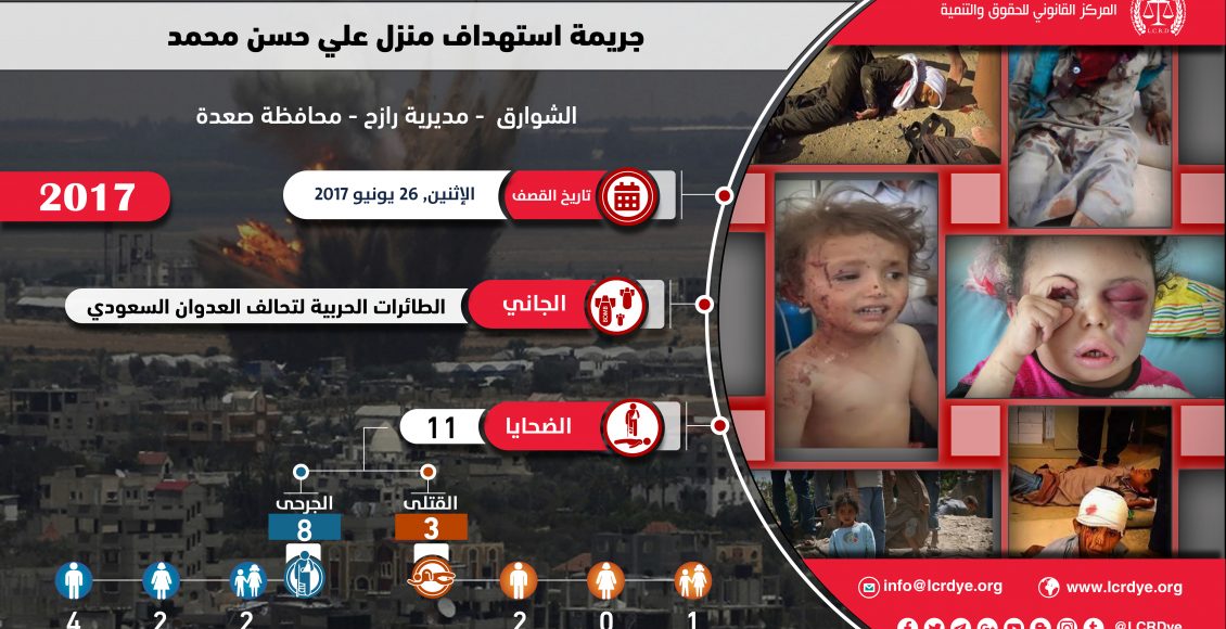 ملخص: في صباح يوم الاثنين 26/6/2017م ثاني أيام عيد الفطر المبارك استهدفت طائرات التحالف السعودي بشكل مباشر منزل المواطن علي حسن محمد حسن متعمدة قتله وأفراد عائلته بغارتين نتج عنها إحالة المنزل إلى ركام اختلط بأشلاء من بداخله، وهم الأب وابنه سليمان وحفيده منتظر وجرح (7) آخرين من أفراد عائلته وأسرة جيرانه وتضرر المنازل المجاورة … تابع قراءة مقتل وإصابة مدنيين بقصف منزل علي حسن محمد منطقة الشوارق – قرية الجوة – مديرية رازح – صعدة بتاريخ 26/6/2017