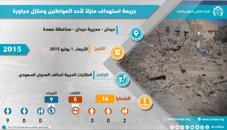 في يوم الأربعاء الموافق 1 يوليو2015 قامت الطائرات الحربية لتحالف العدوان السعودي بشن غارات جوية استهدفت منزلاً لأحد المواطنين ومنازل مجاورة في حيدان بمديرية حيدان – محافظة صعدة تسبب في مقتل 5 مدنيين بينهم 2 أطفال وإصابة 9 مدنيين.