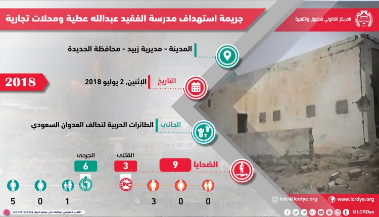في يوم الإثنين الموافق 2 يوليو2018 قامت الطائرات الحربية لتحالف العدوان السعودي بشن غارات جوية استهدفت مدرسة الفقيد عبدالله عطية ومحلات تجارية في المدينة بمديرية زبيد – محافظة الحديدة تسبب في مقتل 3 مدنيين وإصابة 6 مدنيين بينهم طفل.