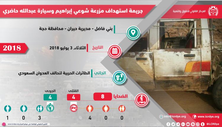 في يوم الثلاثاء الموافق 3 يوليو2018 قامت الطائرات الحربية لتحالف العدوان السعودي بشن غارات جوية استهدفت مزرعة شوعي إبراهيم وسيارة عبدالله حاضري في بني فاضل بمديرية حيران – محافظة حجة تسبب في مقتل 4 مدنيين وإصابة 4 مدنيين بينهم 3 أطفال.