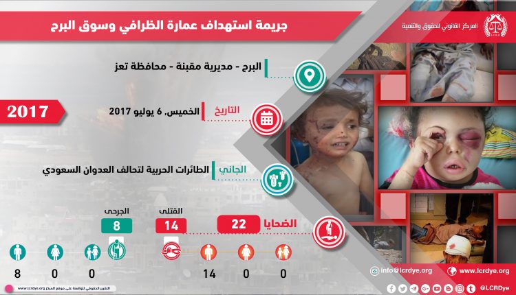 في يوم الخميس الموافق 6 يوليو2017 قامت الطائرات الحربية لتحالف العدوان السعودي بشن غارات جوية استهدفت عمارة الظرافي وسوق البرح في البرح بمديرية مقبنة – محافظة تعز تسبب في مقتل 14 مدنيا وإصابة 8 مدنيين آخرين.