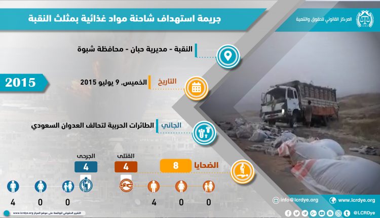 في يوم الخميس الموافق 9 يوليو2015 قامت الطائرات الحربية لتحالف العدوان السعودي بشن غارات جوية استهدفت شاحنة مواد غذائية بمثلث النقبة في النقبة بمديرية حبان – محافظة شبوة تسبب في مقتل 4 مدنيين وإصابة 4 مدنيين آخرين.