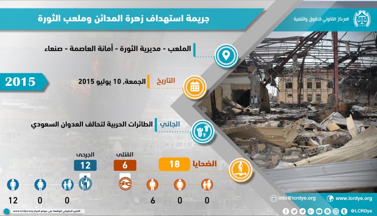 في يوم الجمعة الموافق 10 يوليو2015 قامت الطائرات الحربية لتحالف العدوان السعودي بشن غارات جوية استهدفت زهرة المدائن وملعب الثورة في الملعب بمديرية الثورة – أمانة العاصمة – صنعاء تسبب في مقتل 6 مدنيين وإصابة 12 مدنياً آخراً.