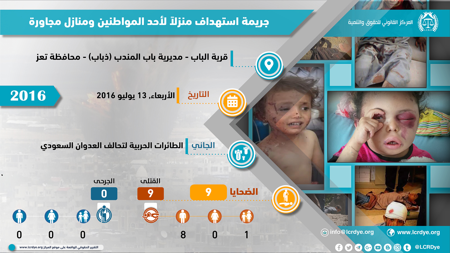 في يوم الأربعاء الموافق 13 يوليو2016 قامت الطائرات الحربية لتحالف العدوان السعودي بشن غارات جوية استهدفت منزلاً لأحد المواطنين ومنازل مجاورة في قرية الباب بمديرية باب المندب (ذباب) – محافظة تعز تسبب في مقتل 9 مدنيين بينهم طفل
