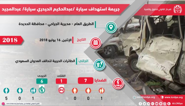 في يوم الإثنين الموافق 16 يوليو2018 قامت الطائرات الحربية لتحالف العدوان السعودي بشن غارات جوية استهدفت سيارة /عبدالحكيم الحيدري وسيارة/ عبدالمجيد الحيدري والتي كانتا تقلا نازحين من أسرة الحيدري أثناء عبورهم في الطريق العام بمديرية الجراحي – محافظة الحديدة تسبب في مقتل طفل وإصابة 6 مدنيين بينهم طفل.