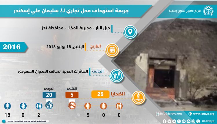 في يوم الإثنين الموافق 18 يوليو2016 قامت الطائرات الحربية لتحالف العدوان السعودي بشن غارات جوية استهدفت محل تجاري لـ/ سليمان علي إسكندر في جبل النار بمديرية المخاء – محافظة تعز تسبب في مقتل 5 مدنيين وإصابة 20 مدنياً بينهم 2 أطفال.