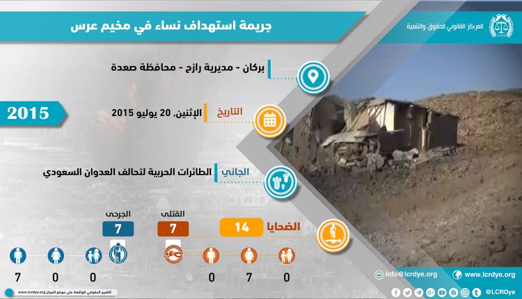 في يوم الإثنين الموافق 20 يوليو2015 قامت الطائرات الحربية لتحالف العدوان السعودي بشن غارات جوية استهدفت نساء في مخيم عرس في بركان بمديرية رازح – محافظة صعدة تسبب في مقتل 7 مدنيين بينهم 7 نساء وإصابة 7 مدنيين آخرين.