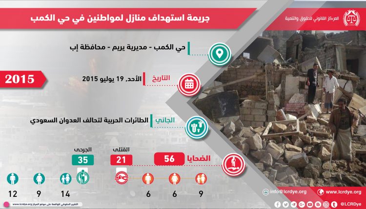 في يوم الأحد الموافق 19 يوليو2015 قامت الطائرات الحربية لتحالف العدوان السعودي بشن غارات جوية استهدفت منازل لمواطنين في حي الكمب بمديرية يريم – محافظة إب تسبب في مقتل 21 مدنياً بينهم 9 أطفال و 6 نساء وإصابة 35 مدنياً بينهم 14 طفل و 9 نساء.