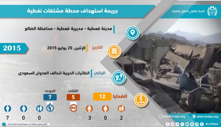 في يوم الإثنين الموافق 20 يوليو2015 قامت الطائرات الحربية لتحالف العدوان السعودي بشن غارات جوية استهدفت محطة مشتقات نفطية في مدينة قعطبة بمديرية قعطبة – محافظة الضالع تسبب في مقتل 5 مدنيين بينهم 2 أطفال وإصابة 7 مدنيين آخرين.