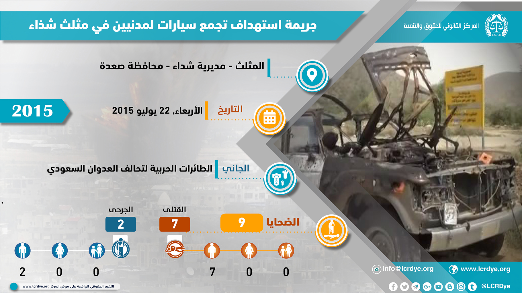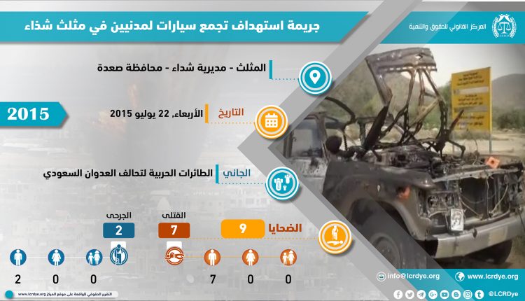 في يوم الأربعاء الموافق 22 يوليو2015 قامت الطائرات الحربية لتحالف العدوان السعودي بشن غارات جوية استهدفت تجمع سيارات لمدنيين في مثلث شذاء بمديرية شداء – محافظة صعدة تسبب في مقتل 7 مدنيين وإصابة 2 مدنيين آخرين.