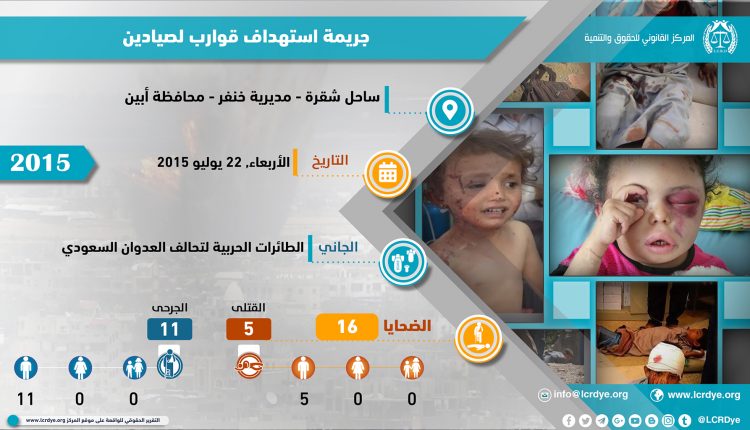 في يوم الأربعاء الموافق 22 يوليو2015 قامت الطائرات الحربية لتحالف العدوان السعودي بشن غارات جوية استهدفت قوارب لصيادين في ساحل شقرة بمديرية خنفر – محافظة أبين تسبب في مقتل 5 مدنيين وإصابة 11 مدنياً آخراً.