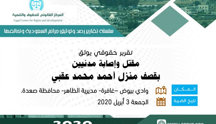 شن طيران التحالف السعودي غارة جوية عند الساعة الـ 1:30 قبل فجر يوم الجمعة الموافق 3 ابريل 2020م ، استهدفت منزل المواطن/ أحمد محمد عقبي الكائن بوادي بيوض منطقة غافرة – مديرية الظاهر – بمحافظة صعدة، دمرت منزله وأودت بحياة (3) من أطفاله أعمارهم دون سن الـ 16 عاماً، هم : ( بشار أحمد 12 عاماً، بسام أحمد 15 عاماً ، جساس أحمد 16 عاماً ) وجرحت شقيقتهم الطفلة: ( رحاب أحمد محمد عقبي 7 سنوات) تم اسعافها إلى المركز الصحي ، الغارة الجوية أدت أيضاً إلى نفوق قطعان أغنام تعتبر مصدر دخل للأسرة المنكوبة لتوفير متطلبات معيشتهم الضرورية.